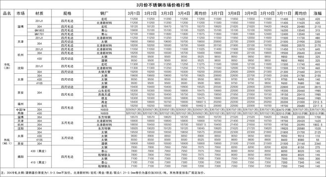 受到鎳價格上漲影響,國內(nèi)近期不銹鋼市場動蕩較明顯,3月第2周不銹鋼市場價格較3月第1周有明顯的的上漲情況,上漲幅度最高每噸可達21900元/噸的價格。其中冷軋201不銹鋼在3月4日價格達到11200元/噸,并于3月7日價格迅速調(diào)整到11500元/噸,價格上漲300元/噸。同系列冷軋201不銹鋼于3月10日價格回調(diào)至11500,降幅達到350元/噸。