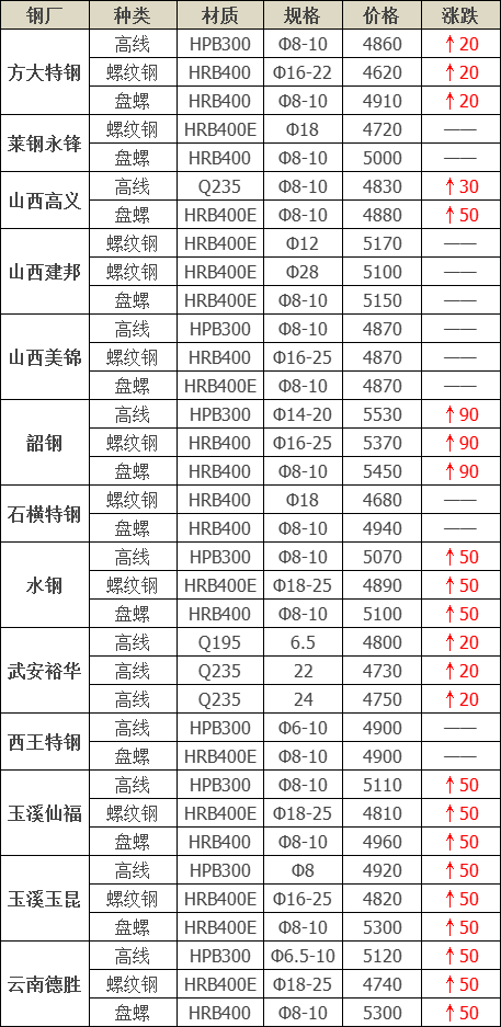 鋼廠調價今日建材共13家鋼廠調價發布,其中: