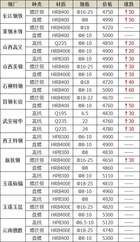 鋼廠調價今日建材共12家鋼廠調價發布,其中: