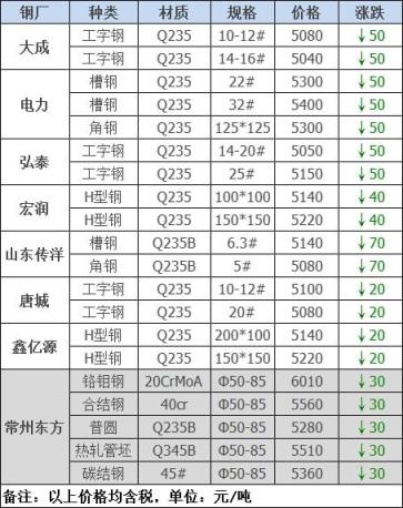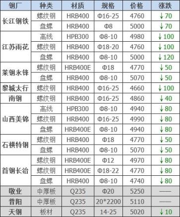 25日12:00起江陰西城刨花類下調(diào)50-60,其他不變,調(diào)后:精爐料4000重廢3890中廢3830普通爐料3770鋼筋頭4000沖子3890-3940冷熱軋料3790-3890爐料壓塊3600鐵皮壓塊3300鋼刨花3600數(shù)控刨花3510普通刨花3420刨花壓塊3360刨花長絲3310含稅單位:元/噸。
