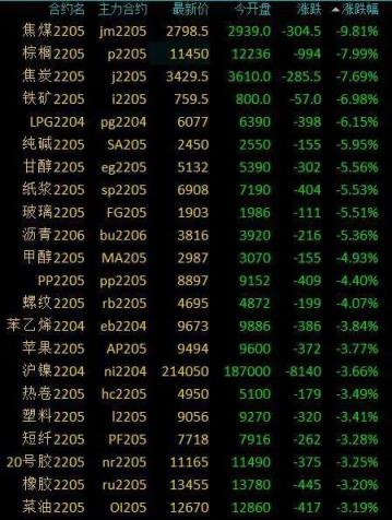 3月14日,國內商品期貨收盤紛紛上演了一出“跌媽不認”:焦煤跌近10%,棕櫚油、焦炭等跌超7%,瀝青、紙漿等跌超5%,PP、鄭醇等跌超4%,蘋果、塑料等跌逾3%,燃油、PVC等跌超2%,滬銀、菜粕等跌超1%,滬銅、滬鉛等小幅下跌。
