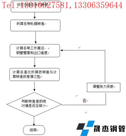計(jì)算方法是:首先根據(jù)給定的主輔電機(jī)轉(zhuǎn)速折算出各道次軋輥轉(zhuǎn)速(公式1),然后設(shè)定各道次張力系數(shù)。由于孔型尺寸是一定的,所以設(shè)定好各道次的張力系數(shù)后,根據(jù)公式(2,3)可以計(jì)算出各道次軋輥的工作直徑和各道次軋后的厚壁鋼管壁厚。據(jù)此,可以計(jì)算出各道次厚壁鋼管的延伸系數(shù)和出口速度(公式4),然后再根據(jù)出口速度和軋制直徑計(jì)算各道次軋輥轉(zhuǎn)數(shù)(公式5)。如果設(shè)定的張力系數(shù)不合適,那么,計(jì)算出的軋輥轉(zhuǎn)數(shù)與根據(jù)主、輔電機(jī)轉(zhuǎn)數(shù)折算出的軋輥轉(zhuǎn)數(shù)就會(huì)出現(xiàn)差值。此時(shí), 可采用各道次轉(zhuǎn)數(shù)差的絕對(duì)值之和作為是否終止計(jì)算的依據(jù)。如果此數(shù)值達(dá)到足夠小,便可以終止計(jì)算。圖1為用計(jì)算機(jī)進(jìn)行道次壁厚計(jì)算的框圖。