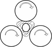 阿塞爾軋管機(jī)(ASSEL Mill)的三個(gè)軋輥在機(jī)架中呈120度角布置,與長(zhǎng)芯棒構(gòu)成一個(gè)相對(duì)封閉的環(huán)狀孔型。軋輥軸線相對(duì)于軋制中心線垂直方向和水平方向均傾斜于一定角度,分別叫喂入角和輾軋角。軋輥形狀呈錐形,中間段有一個(gè)凸起叫做輥肩,軋制時(shí)與長(zhǎng)芯棒完成集中變形,實(shí)現(xiàn)較大的壓下量,延伸系數(shù)可達(dá)2左右。