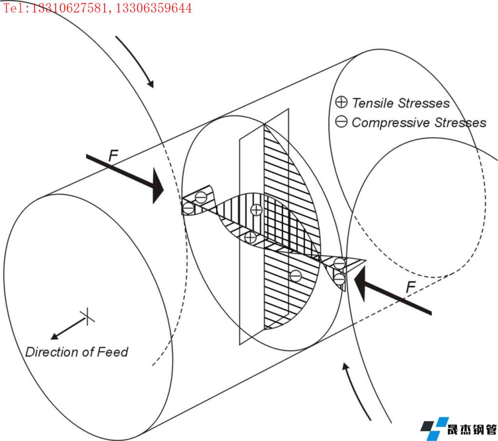 圖4-6顯示管坯的受力情況,圖中顯示F為軋輥方向(平面)的力,為壓應(yīng)力,在接觸點(diǎn)的位置顯示為最大。中心部位(導(dǎo)盤(pán)方向)顯示為拉應(yīng)力,理論上在導(dǎo)盤(pán)的中心部位受力為最大。因?yàn)楣芘鞯牟粩嘈D(zhuǎn),同一部位的受力情況不斷變化,導(dǎo)致中心部位的金屬受到交變應(yīng)力的作用,中心產(chǎn)生疏松,形成孔腔。