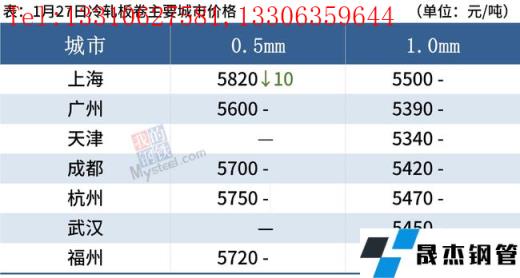 冷軋板卷:1月27日,全國24個主要城市1.0mm冷卷均價5468元/噸,較上個交易日持平。據(jù)不完全統(tǒng)計,現(xiàn)冷軋無縫鋼管廠家庫存36.05萬噸,周環(huán)比增加1.64萬噸,社會庫存125.26萬噸,周環(huán)比增加2.88萬噸,周消費(fèi)量77.89萬噸,環(huán)比減少1.95萬噸。綜合來看,故預(yù)計28日國內(nèi)冷軋板卷價格或?qū)⒗^續(xù)平穩(wěn)運(yùn)行。