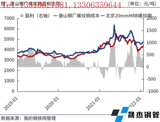 成本方面,據(jù)筆者測算,1月底唐山長流程無縫鋼管廠家螺紋鋼噸鋼毛利(成本不包含三項費用、折舊等)300元/噸左右。由于1月份原燃料價格漲幅高于鋼價,導致無縫鋼管廠家效益有所下滑,部分電爐廠因虧損減產(chǎn)。
