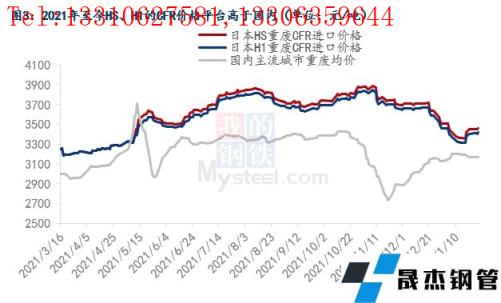 放開廢鋼進口后的首年,進口量卻不及預期,2021年進口總量僅為55.5萬噸,遠低于2019年之前平均每年200萬噸以上的水平。原因主要有兩方面:一是政策導向,2021年能夠入境的再生鋼鐵料所對應的海關(guān)商品編碼只有5類,其對應的海關(guān)編碼分別是:7204100010(鑄鐵碎料)、7204210010(不銹碎料)、7204290010(其他合金碎料)、7204410010(粉狀廢料)、7204490030(其他廢碎料),上述類別均屬于純凈的優(yōu)質(zhì)廢鋼,政策決定了廢鋼的進口門檻變高;二是以日本優(yōu)質(zhì)重廢HS、H1為例,兩種料形的CFR價格平臺在2021年中均高于國內(nèi)主流城市的重廢均價(圖3),由于這兩種料形均屬于日本國內(nèi)的優(yōu)質(zhì)廢鋼,其資源量本身就有限,出口量不大,外加東亞地區(qū)的其他國家也會從日本進口該料形,所以這種優(yōu)質(zhì)廢鋼在2021年中基本處于供小于求的狀態(tài),價格因此高企。但以日本中廢H2為例,由于該料形要差于HS、H1,所以H2料形的CFR價格平臺接近國內(nèi)主流城市的中廢均價(圖4)。
