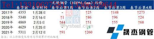 小編匯總近5年春節(jié)后四周無縫厚壁鋼管均價(jià)變化情況,以供參考。從近5年時(shí)間來看,無縫管以上漲為主,只有2020年由于公共衛(wèi)生事件影響,需求遲遲無法啟動(dòng),導(dǎo)致價(jià)格回落,其他幾年都出現(xiàn)了“開門紅”。