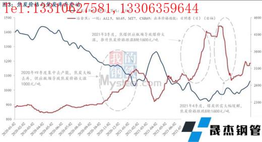 2)而2021年雖沒有再出現(xiàn)2020年4季度集中大幅去產(chǎn)能的情況。但仍出現(xiàn)了2021年三季度焦炭價格大漲1600元/噸的情形,兩個半月漲幅48%,漲幅明顯高于2020年四季度。這主要是由于焦煤供應(yīng)受限導致的煤價大漲推升焦炭成本大幅上漲,以呂梁低硫主焦煤來看,其價格從6月底至9月底漲了一倍(2050-4100元/噸),焦炭供應(yīng)矛盾從產(chǎn)能約束轉(zhuǎn)移至原料供應(yīng)受限。同樣的,2021年四季度后,國家出臺煤炭保供政策,原料供應(yīng)大幅緩解,同時需求端鐵水產(chǎn)量大減,最終傳導至焦煤價格大跌,焦炭價格應(yīng)聲回落1600元/噸。