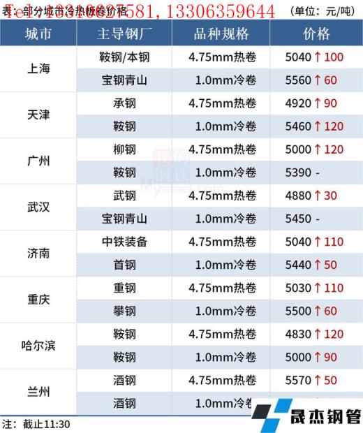 ◎上海:7日早盤熱卷市場價(jià)格漲100,現(xiàn)主流報(bào)價(jià)1500普5020-5040元/噸,1800報(bào)5060-5090元/噸;1500錳5150元/噸,1800報(bào)5200元/噸左右,2.75Q235B報(bào)5130-5160元/噸,2.75SPHC報(bào)5250元/噸左右。(單位:元/噸)
