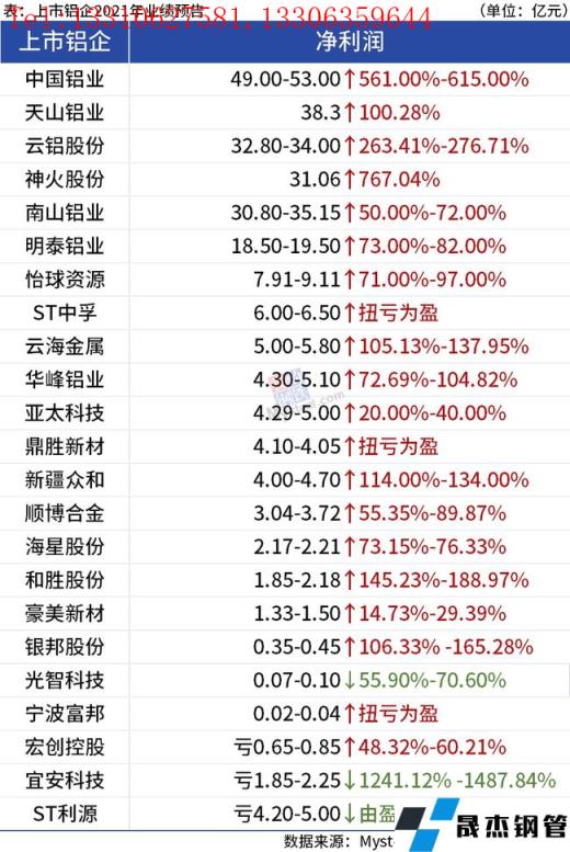 免責聲明:本網站(山東聊城晟杰無縫鋼管廠m.qiazhuo.cn)刊載的“23家上市鋁企披露2021年業績預報,超8成凈利潤增長”等均源于網絡,版權歸原作者所有,且僅代表原作者觀點,本文所載信息僅供參考。轉載僅為學習與交流之目的,如無意中侵犯您的合法權益,請及時聯系刪除。本網站刊登此篇文章并不意味著本站贊同其觀點或證實其內容的真實性,我們不對其科學性、嚴肅性等作任何形式的保證。如果侵犯了您的版權,請盡快聯系我們予以撤銷,謝謝合作!