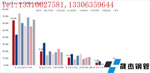 本地調研,我們還就企業是否有出口業務、出口業務比重有進行了調研。 調研顯示,完全沒有出口業務的企業占比63.99%,有出口業務,比重不到10%的企業占比19.82%,有出口業務,比重在10%~20%的企業占比10.91%,有出口業務,比重在20%~50%的企業占比3.68%,有出口業務,比重在50%以上的占比只有1.60%。分行業來看,幾乎所有行業出口占比都比較低,其中生產企業整體要高于其他行業。