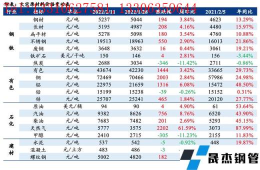 免責聲明:本網站(山東聊城晟杰無縫鋼管廠m.qiazhuo.cn)刊載的“周報:大宗原材料價格周報(2.07-2.11)”等均源于網絡,版權歸原作者所有,且僅代表原作者觀點,本文所載信息僅供參考。轉載僅為學習與交流之目的,如無意中侵犯您的合法權益,請及時聯系刪除。本網站刊登此篇文章并不意味著本站贊同其觀點或證實其內容的真實性,我們不對其科學性、嚴肅性等作任何形式的保證。如果侵犯了您的版權,請盡快聯系我們予以撤銷,謝謝合作!