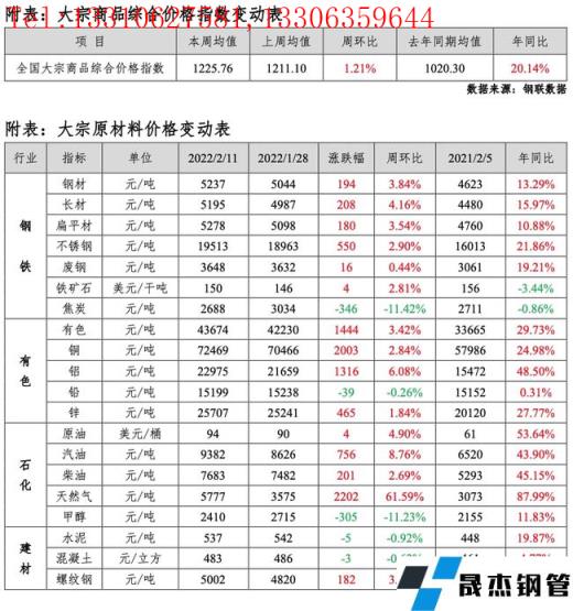 免責聲明:本網站(山東聊城晟杰無縫鋼管廠m.qiazhuo.cn)刊載的“MRI:大宗原材料價格周報(2月7日-2月11日)”等均源于網絡,版權歸原作者所有,且僅代表原作者觀點,本文所載信息僅供參考。轉載僅為學習與交流之目的,如無意中侵犯您的合法權益,請及時聯系刪除。本網站刊登此篇文章并不意味著本站贊同其觀點或證實其內容的真實性,我們不對其科學性、嚴肅性等作任何形式的保證。如果侵犯了您的版權,請盡快聯系我們予以撤銷,謝謝合作!