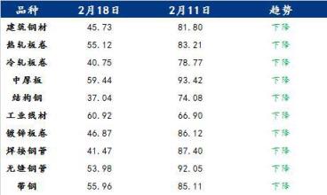 具體各品種指數來看,2月18日建筑厚壁無縫鋼管情緒指數為45.73,較2月11日回落36.07;熱軋板卷情緒指數為55.12,較2月11日回落28.09;冷軋板卷情緒指數為40.75,較2月11日回落38.02;中厚板情緒指數為59.44,較2月11日回落33.98;結構鋼情緒指數為37.04,較2月11日回落37.04;工業線材情緒指數為60.92,較2月11日回落5.98;鍍鋅板卷情緒指數為46.87,較2月11日回落39.25;焊接厚壁鋼管情緒指數為41.47,較2月11日回落45.93;無縫厚壁鋼管情緒指數為53.98,較2月11日回落38.07;帶鋼情緒指數為55.96,較2月11日回落29.15。