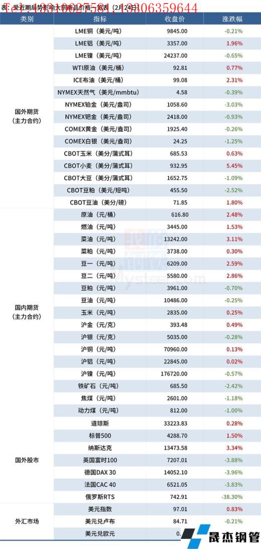 免責聲明:本網(wǎng)站(山東聊城晟杰無縫鋼管廠m.qiazhuo.cn)刊載的“受近期局勢影響大宗商品價格一覽表(2月24日)”等均源于網(wǎng)絡,版權(quán)歸原作者所有,且僅代表原作者觀點,本文所載信息僅供參考。轉(zhuǎn)載僅為學習與交流之目的,如無意中侵犯您的合法權(quán)益,請及時聯(lián)系刪除。本網(wǎng)站刊登此篇文章并不意味著本站贊同其觀點或證實其內(nèi)容的真實性,我們不對其科學性、嚴肅性等作任何形式的保證。如果侵犯了您的版權(quán),請盡快聯(lián)系我們予以撤銷,謝謝合作!