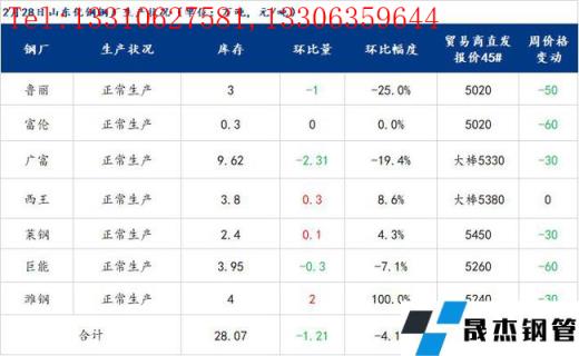 數(shù)據(jù):山東優(yōu)特無縫厚壁鋼管廠家?guī)齑?8.07萬噸,環(huán)比增下降1.21萬噸,減少4.13%,同比增加2.87萬噸,增長11.39%。
