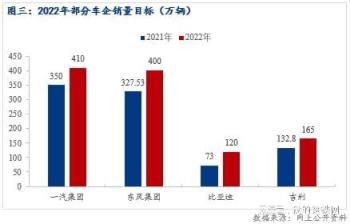 隨著2021年年底芯片緊張問題得到逐漸緩解。展望2022年汽車市場(chǎng),如不再受到“缺芯”影響,汽車產(chǎn)能可以得到良好的釋放。從汽車銷售市場(chǎng)來看,在供給得到改善的情況下,今年的汽車銷量仍會(huì)保持較高增長(zhǎng),其中包含回補(bǔ)去年由于產(chǎn)量不足而導(dǎo)致的銷量缺失部分。我們?cè)诰W(wǎng)上公開資料了解到,各大車企在制定今年的銷量目標(biāo)時(shí)都是保持穩(wěn)增長(zhǎng)的態(tài)勢(shì)。在此做了簡(jiǎn)單整理: