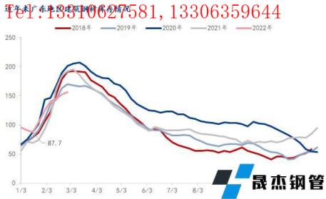 庫(kù)存方面,截止2月28日,根據(jù)廣州建材倉(cāng)庫(kù)同口徑統(tǒng)計(jì),建筑厚壁無縫鋼管總庫(kù)存156.1萬噸,周環(huán)比增加3.92萬噸,連續(xù)6周回升。其中螺紋鋼庫(kù)存92.7萬噸,周環(huán)比增加5.06萬噸;線材63.4萬噸,周環(huán)比減少1.14萬噸。近年來春節(jié)后廣東省庫(kù)存量均呈現(xiàn)增加態(tài)勢(shì),其中2020年節(jié)后庫(kù)存總量最高;據(jù)調(diào)研,節(jié)后廣東建筑厚壁無縫鋼管庫(kù)存峰值均出現(xiàn)第3-5周,累庫(kù)周期約24天左右;雖然2022年節(jié)前價(jià)格偏高,但節(jié)前現(xiàn)貨價(jià)格上漲,帶動(dòng)市場(chǎng)不少商家主動(dòng)性囤貨、備貨,節(jié)前庫(kù)存總量并未出現(xiàn)明顯累庫(kù)現(xiàn)象。節(jié)后開市,在疫情等因素影響下,累庫(kù)速度遠(yuǎn)低于往年,因此預(yù)計(jì)短期庫(kù)存仍有增加的可能,但峰值難超去年,且最近2-3周可能會(huì)迎來庫(kù)存拐點(diǎn)。