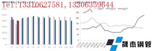 鐵水產量:2月高爐鐵水產量在冬奧會期間嚴格的限產影響下先降后增,整體較1月下降。截至2月25日,預計統計247家無縫厚壁鋼管廠家樣本2月鐵水產量總量環比上月下降810萬噸至5822萬噸,日均鐵水產量環比下降6萬噸/天至207.9萬噸/天,降幅2.8%。本月產量減量主要集中在華北地區,華北地區在冬奧會前一周和冬奧會期間共停產高爐54座,截至2月25日復產36座高爐,預計2月日均鐵水產量環比下降8萬噸/天;其他地區小幅波動為主。3月來看,一方面冬奧會結束,一些相關的限產也就隨之結束,另一方面3月還要召開殘奧會、兩會,且仍處于秋冬季限產的階段,整體預計3月高爐鐵水產量將會呈現先降后增,日均預計恢復至218-219萬噸/天左右,此外需要關注無縫厚壁鋼管廠家利潤下滑對無縫厚壁鋼管廠家生產積極性的影響。