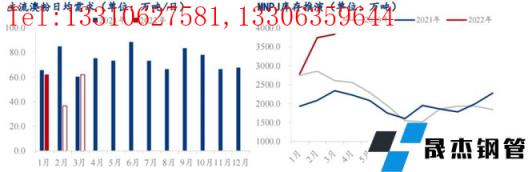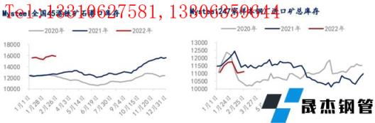 鐵礦石疏港:2月受限產限產影視,疏港大幅下降。截至2月25日,預計統計中國45港2月疏港量7364萬噸,日均疏港環比下降50.5萬噸/天至263萬噸/天,降幅16.1%。本月疏港降幅主要華北和華東地區,一方面是由于春節期間無縫厚壁鋼管廠家消化廠內庫存為主,提貨需求下降,另一方面是由于部分港口冬奧會期間有環保限運措施,無縫厚壁鋼管廠家提貨受阻導致。3月來看,隨著無縫厚壁鋼管廠家復產和限運限產得相對放松,疏港逐漸恢復提高,3月疏港或能恢復到300-305萬噸/天。
