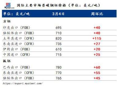 獨(dú)聯(lián)體鋼坯供應(yīng)短缺使得其歐洲買(mǎi)家積極采購(gòu)?fù)炼滟Y源。土耳其方坯也在本周大幅上漲,據(jù)了解,今日土耳其方坯出口報(bào)價(jià)高達(dá)820美元/噸FOB,漲幅超過(guò)100美元/噸,土耳其無(wú)縫厚壁鋼管廠(chǎng)家對(duì)于鋼坯價(jià)格保持樂(lè)觀(guān)態(tài)度,部分無(wú)縫厚壁鋼管廠(chǎng)家轉(zhuǎn)向?qū)W⒂阡撆鞒隹冢饲埃炼渲饕隹诼菁y鋼。從一家無(wú)縫厚壁鋼管廠(chǎng)家處了解到,目前市場(chǎng)交易積極,預(yù)計(jì)下周土耳其國(guó)內(nèi)價(jià)格會(huì)達(dá)到850美元/噸,而出口價(jià)格也會(huì)隨之上漲。