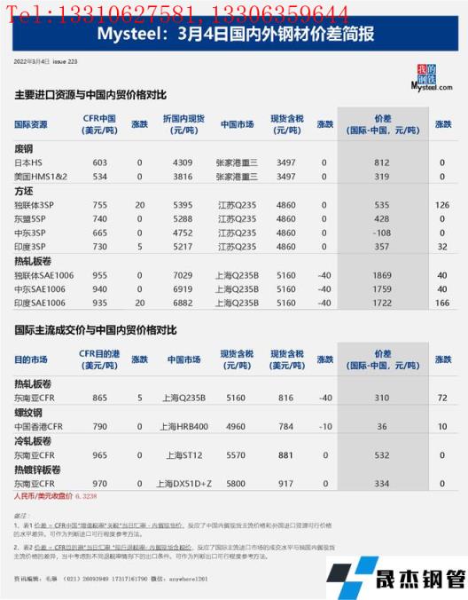 免責聲明:本網站(山東聊城晟杰無縫鋼管廠m.qiazhuo.cn)刊載的“2022年03月04日日報:國內外鋼材_無縫鋼管價差匯總(2022.3.4)”等均源于網絡,版權歸原作者所有,且僅代表原作者觀點,本文所載信息僅供參考。轉載僅為學習與交流之目的,如無意中侵犯您的合法權益,請及時聯系刪除。本網站刊登此篇文章并不意味著本站贊同其觀點或證實其內容的真實性,我們不對其科學性、嚴肅性等作任何形式的保證。如果侵犯了您的版權,請盡快聯系我們予以撤銷,謝謝合作!