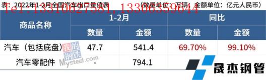 免責聲明:本網站(山東聊城晟杰無縫鋼管廠m.qiazhuo.cn)刊載的“海關總署:1-2月中國出口汽車47.7萬輛,同比增69.70%”等均源于網絡,版權歸原作者所有,且僅代表原作者觀點,本文所載信息僅供參考。轉載僅為學習與交流之目的,如無意中侵犯您的合法權益,請及時聯系刪除。本網站刊登此篇文章并不意味著本站贊同其觀點或證實其內容的真實性,我們不對其科學性、嚴肅性等作任何形式的保證。如果侵犯了您的版權,請盡快聯系我們予以撤銷,謝謝合作!