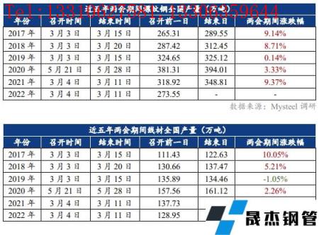 近五年兩會期間建筑厚壁無縫鋼管價格基本呈現(xiàn)下行趨勢,2017年和2018年價格下行的主要原因是下游需求不振;2019年價格上漲的主要原因是限產(chǎn)加嚴導(dǎo)致供給偏低疊加下游需求恢復(fù)良好;2020年和2021年價格走低的主要原因是兩會期間建筑厚壁無縫鋼管產(chǎn)量高位運行,供大于求。今年兩會期間,產(chǎn)量和庫存都處于往年平均線之下,供應(yīng)量相對偏低,同時一季度市場需求不斷回暖,若需求恢復(fù)力度尚可,疊加國內(nèi)宏觀利好持續(xù)推進,預(yù)計“兩會期間”建筑厚壁無縫鋼管價格或?qū)⒗^續(xù)震蕩偏強運行。