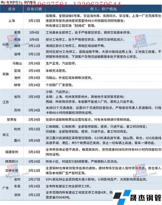 近期,全國(guó)疫情呈現(xiàn)局部高度聚集和多點(diǎn)散發(fā)態(tài)勢(shì),對(duì)國(guó)內(nèi)大宗商品市場(chǎng)的供應(yīng)端、需求端、物流及倉(cāng)儲(chǔ)等方面都有不同程度的影響。據(jù)統(tǒng)計(jì),截至3月15日,全國(guó)多個(gè)省市發(fā)布停工停產(chǎn)情況。其中受疫情影響最大的吉林省于3月12日宣布,長(zhǎng)春市主要厚壁無縫鋼管倉(cāng)庫(kù)暫停出庫(kù),當(dāng)?shù)亟ú氖袌?chǎng)交投進(jìn)入暫時(shí)停滯狀態(tài),倉(cāng)庫(kù)入庫(kù)及本地?zé)o縫厚壁鋼管廠家生產(chǎn)暫時(shí)正常。深圳市于3月12日宣布,全市范圍內(nèi)所有建設(shè)工地暫定停工排查4天,南山及福田區(qū)域厚壁無縫鋼管市場(chǎng)預(yù)計(jì)共影響需求量約6640噸。與此同時(shí),全國(guó)其他地區(qū)鋼貿(mào)交易也受到影響,部分工地開始停工,物流運(yùn)輸暫停服務(wù)。具體情況如下: