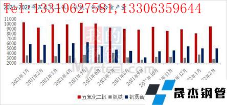 從消費端看,我們將近三年無縫厚壁鋼管廠家對釩合金的消費量進行對比,不難發現,3-5月為無縫厚壁鋼管廠家需求高峰期,并且近三年都是在5月份達到一個相對高值。考慮到22年春節相較21年有所提前,復工復產提早,今年大概率無縫厚壁鋼管廠家對于釩合金高峰消費量會提前到3月末-4月份,也就是下輪鋼招開啟時間。