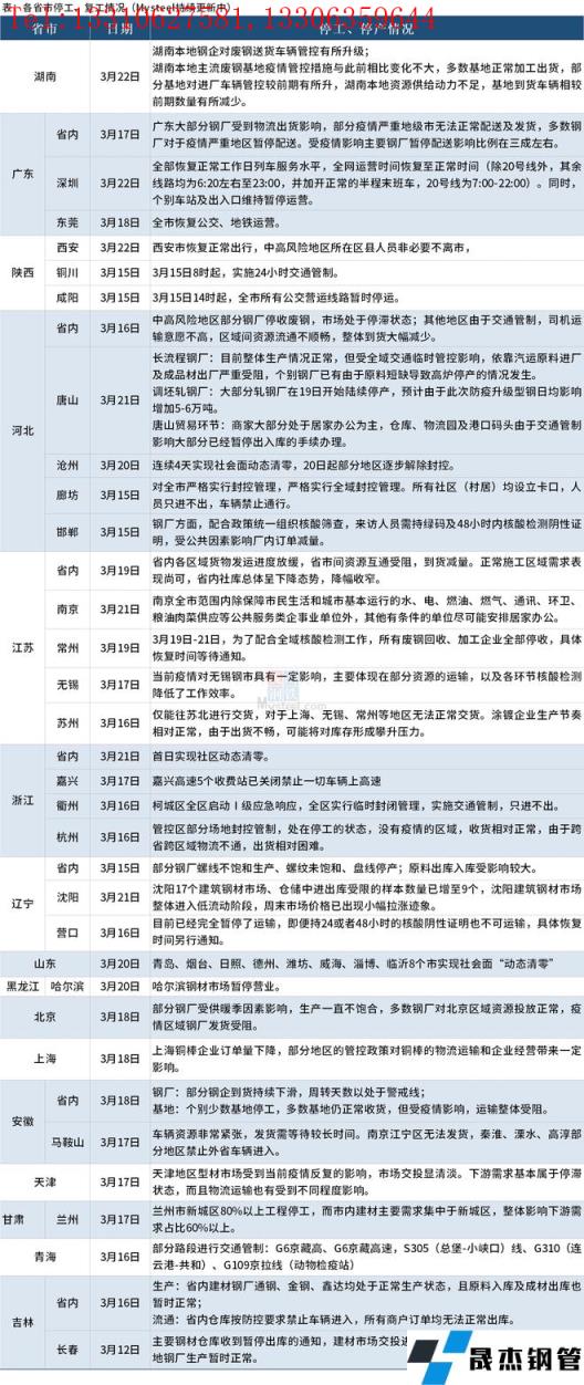 截至3月22日,匯總了16個省份停工復(fù)工最新信息。其中,湖南省本地鋼企對廢鋼送貨車輛管控有所升級;主流廢鋼基地疫情管控措施與此前相比變化不大,多數(shù)基地正常加工出貨,部分基地對進(jìn)廠車輛管控較前期有所升。唐山長流程無縫厚壁鋼管廠家目前整體生產(chǎn)情況正常,但受全域交通臨時管控影響,依靠汽運原料進(jìn)廠及成品材出廠嚴(yán)重受阻,個別無縫厚壁鋼管廠家已有由于原料短缺導(dǎo)致高爐停產(chǎn)的情況發(fā)生。山東省已有青島、煙臺、日照、德州、濰坊、威海、淄博、臨沂8個市實現(xiàn)社會面“動態(tài)清零”。具體情況如下:
