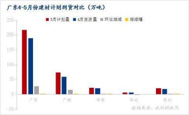 2、5月廣東地區(qū)建筑材區(qū)內(nèi)(廣東和廣西)計(jì)劃供應(yīng)量共計(jì)290萬噸,環(huán)比增加7.9萬噸,增幅2.8%;區(qū)外計(jì)劃供應(yīng)量為49.1萬噸,環(huán)比增加0.2萬噸,增幅0.4%;