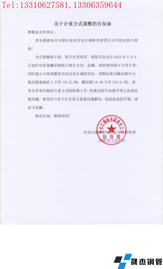 免責聲明:本網站(山東聊城晟杰無縫鋼管廠m.qiazhuo.cn)刊載的“冷水江鋼鐵有限責任公司關于對貴州區域計重方式調整的告知函”等均源于網絡,版權歸原作者所有,且僅代表原作者觀點,本文所載信息僅供參考。轉載僅為學習與交流之目的,如無意中侵犯您的合法權益,請及時聯系刪除。本網站刊登此篇文章并不意味著本站贊同其觀點或證實其內容的真實性,我們不對其科學性、嚴肅性等作任何形式的保證。如果侵犯了您的版權,請盡快聯系我們予以撤銷,謝謝合作!
