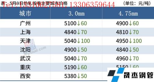 熱軋板卷:5月9日,全國(guó)24個(gè)主要城市4.75mm熱軋板卷均價(jià)5067元/噸,較上個(gè)交易日下跌60元/噸。綜合來(lái)看,美聯(lián)儲(chǔ)加息和縮表落地限制了國(guó)內(nèi)貨幣寬松的空間,國(guó)內(nèi)多地區(qū)疫情爆發(fā),國(guó)內(nèi)外的雙重因素導(dǎo)致情緒不佳,無(wú)縫厚壁鋼管廠家目前面臨虧損的局面,焦煤焦炭的首輪提降已經(jīng)落地,原料端價(jià)格支撐進(jìn)行弱化,原料與成材呈現(xiàn)負(fù)反饋。預(yù)計(jì)下半年經(jīng)濟(jì)沖擊影響依舊,短期成材或?qū)⒕S持偏弱態(tài)勢(shì)。因此,預(yù)計(jì)全國(guó)熱軋板卷10日價(jià)格維持下行趨勢(shì)。