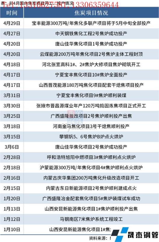 據不完全整理,2022年前4月國內有21個焦炭項目開工、投產。其中,河北張宣高科、張掖市晉昌源煤業和內蒙古慶華集團等焦炭相關項目開工;寶豐能源、中天鋼鐵、山西晉茂能源和河南金馬等焦炭項目投產。具體內容如下: