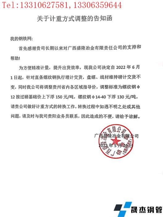免責聲明:本網站(山東聊城晟杰無縫鋼管廠m.qiazhuo.cn)刊載的“廣西盛隆冶金有限公司關于對貴州區域計重方式調整的告知函”等均源于網絡,版權歸原作者所有,且僅代表原作者觀點,本文所載信息僅供參考。轉載僅為學習與交流之目的,如無意中侵犯您的合法權益,請及時聯系刪除。本網站刊登此篇文章并不意味著本站贊同其觀點或證實其內容的真實性,我們不對其科學性、嚴肅性等作任何形式的保證。如果侵犯了您的版權,請盡快聯系我們予以撤銷,謝謝合作!