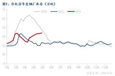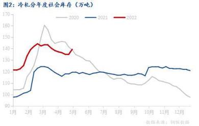 截止5月4日,監(jiān)測的26個城市庫存,冷軋板卷社會庫存為139.41萬噸。社會庫存雖未到達年內(nèi)的峰值,但也同樣處于相對高位。年同比增加19.97萬噸,同比數(shù)據(jù)同樣驚人。主要是汽車、家電等制造業(yè),在疫情下產(chǎn)量紛紛出現(xiàn)下滑,終端用鋼量明顯縮量。但短期局部區(qū)域物流受疫情防控影響,廠庫無法向社庫端去進行轉(zhuǎn)移,因此社庫的累積速度并不及廠庫。