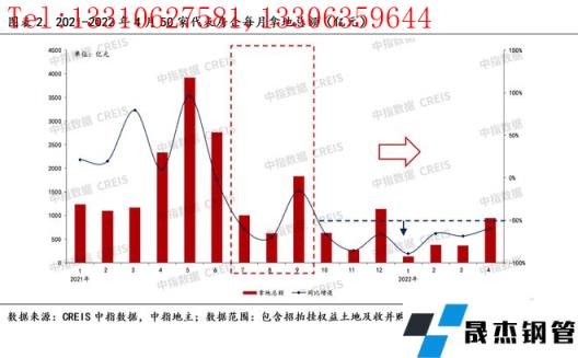 那么,預(yù)判今年用鋼情況的話,可以參考從2021年-2022年4月份以來的50家代表房企每月拿地總額數(shù)據(jù),假如往前倒推6個月,2022年1月起的房地產(chǎn)用鋼情況大致可以參照2021年7月起的拿地?cái)?shù)據(jù),因?yàn)樗⒎且灰粚?yīng)的關(guān)系。我們可以看到,從2021年10月以來的拿地?cái)?shù)據(jù)不容樂觀,單月同比跌幅持續(xù)低于-50%水平線以下,預(yù)示接下來三季度的房地產(chǎn)新開工以及其用鋼情況理論上應(yīng)該是很差的。