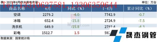 免責聲明:本網站(山東聊城晟杰無縫鋼管廠m.qiazhuo.cn)刊載的“統計局:4月中國四大家電產量3降1增”等均源于網絡,版權歸原作者所有,且僅代表原作者觀點,本文所載信息僅供參考。轉載僅為學習與交流之目的,如無意中侵犯您的合法權益,請及時聯系刪除。本網站刊登此篇文章并不意味著本站贊同其觀點或證實其內容的真實性,我們不對其科學性、嚴肅性等作任何形式的保證。如果侵犯了您的版權,請盡快聯系我們予以撤銷,謝謝合作!