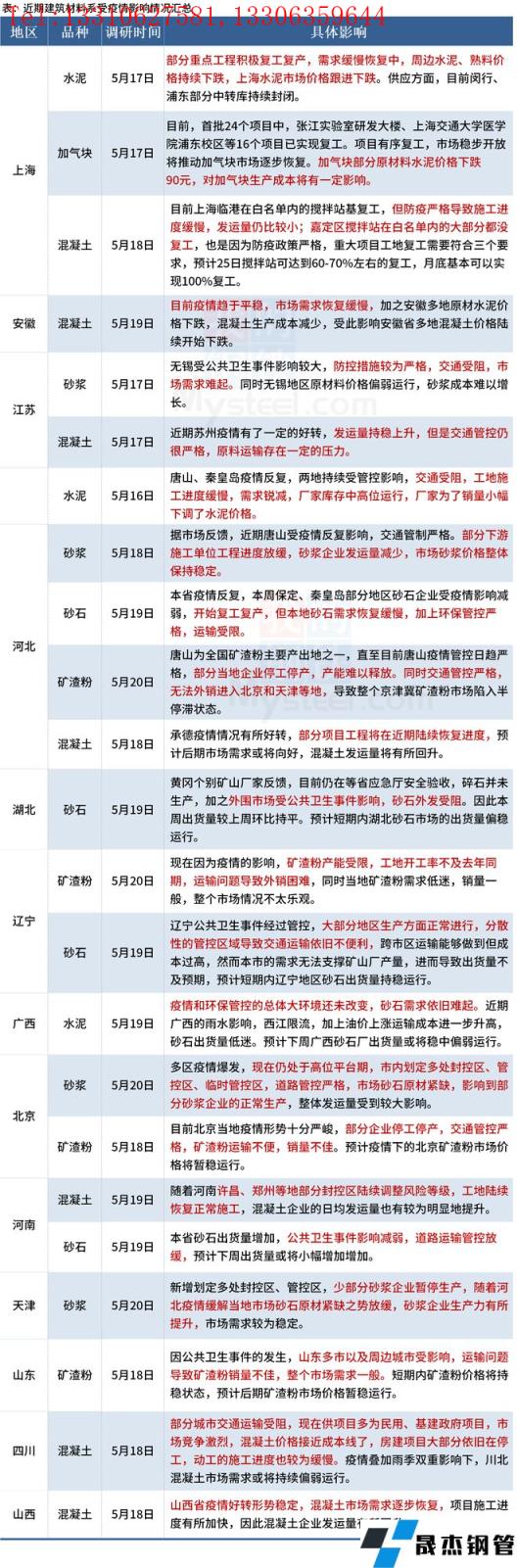 截至5月20日,據(jù)百年建筑網(wǎng)調(diào)研,14個(gè)省份建材市場(chǎng)受到了不同程度的影響。隨著華東、華南疫情和暴雨情況的緩解,物流運(yùn)輸逐步恢復(fù)正常,材料進(jìn)場(chǎng)速度加快,下游工地施工節(jié)奏提升。在疫情有效管控下,基建、房建方面的需求陸續(xù)回升,但由于疫情反復(fù)抬頭的影響,仍有上行空間有限。具體情況如下: