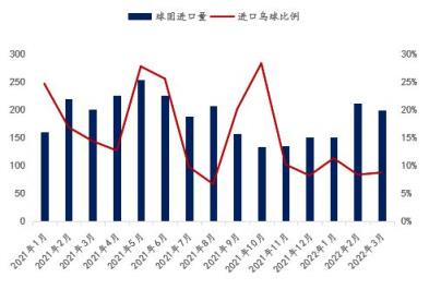 (1)進(jìn)口供應(yīng):俄烏沖突下,烏克蘭海運(yùn)出口清零,同時(shí)在中國(guó)球團(tuán)進(jìn)口量中,進(jìn)口烏克蘭球團(tuán)比例近兩年均值僅有16%,2021年二季度及2022年1-2月份,進(jìn)口比例更是只有8%-11%。所以雖然烏克蘭海運(yùn)出口被限,但對(duì)于中國(guó)國(guó)內(nèi)進(jìn)口球團(tuán)總量影響有限,環(huán)比當(dāng)前情況來看很難出現(xiàn)明顯下降趨勢(shì)。