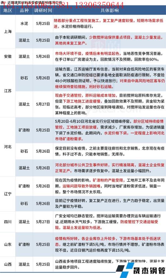 截至5月27日,據(jù)百年建筑網(wǎng)調(diào)研,8個省份建材市場受到了不同程度的影響。進入五月下旬后,施工整體進度尚未進入“減速”階段,今年整體施工進度提升緩慢,市場需求降幅拐點未來臨。目前疫情防控形勢繼續(xù)好轉(zhuǎn),建筑材料發(fā)運量有一定上升空間?,F(xiàn)華東地區(qū)疫情雖得到了一定的控制,但由于交通管控因素,材料運輸仍存在一定壓力。具體情況如下: