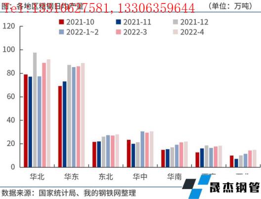 2022年4月份,華北、華東、東北、華中、華南、西南、西北等地區粗鋼日均產量91.9萬噸、88.8萬噸、28.0萬噸、30.5萬噸、22.0萬噸、18.3萬噸和14.8萬噸,分別較3月份增加3.0萬噸、2.9萬噸、0.9萬噸、1.0萬噸、0.7萬噸、0.6萬噸和0.5萬噸。