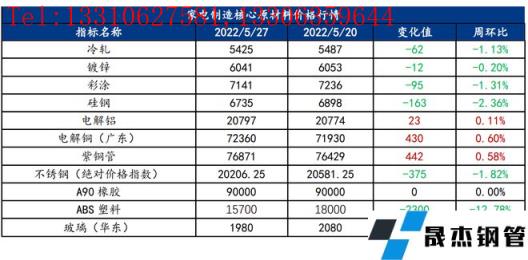 免責聲明:本網站(山東聊城晟杰無縫鋼管廠m.qiazhuo.cn)刊載的“家電原材料周報(5.23-5.27)”等均源于網絡,版權歸原作者所有,且僅代表原作者觀點,本文所載信息僅供參考。轉載僅為學習與交流之目的,如無意中侵犯您的合法權益,請及時聯系刪除。本網站刊登此篇文章并不意味著本站贊同其觀點或證實其內容的真實性,我們不對其科學性、嚴肅性等作任何形式的保證。如果侵犯了您的版權,請盡快聯系我們予以撤銷,謝謝合作!