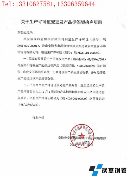 二、上述兩個(gè)生產(chǎn)許可證編號(hào)的產(chǎn)品并存,直至經(jīng)緯輪生產(chǎn)的產(chǎn)品庫存售完為止。6月1日后的產(chǎn)品標(biāo)牌切換為金安不銹鋼鑄造有限公司,鋼筋生產(chǎn)許可證編號(hào)為(皖XK05-001-00009),鋼筋標(biāo)識(shí)為(4E/LG/xx/009)。