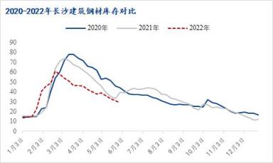 據(jù)統(tǒng)計(jì),截止6月2日長沙建筑厚壁無縫鋼管庫存總量為29.12萬噸,其中螺紋鋼占比74%,線盤占比26%。該庫存水平較去年同期低10.58萬噸。由于浙江、江蘇、湖北等外省厚壁無縫鋼管對長沙投放量明顯減少,因此長沙庫存呈現(xiàn)持續(xù)下降趨勢。