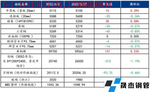 截止2022年6月2日,各原材料當日即時價格以及價格周環(huán)比情況如下: