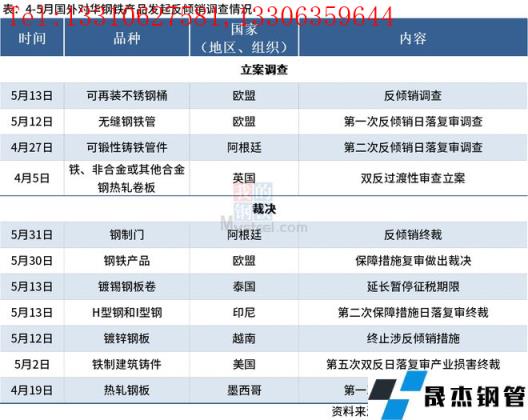 免責聲明:本網站(山東聊城晟杰無縫鋼管廠m.qiazhuo.cn)刊載的“4-5月國外對華鋼鐵產品發起反傾銷調查情況”等均源于網絡,版權歸原作者所有,且僅代表原作者觀點,本文所載信息僅供參考。轉載僅為學習與交流之目的,如無意中侵犯您的合法權益,請及時聯系刪除。本網站刊登此篇文章并不意味著本站贊同其觀點或證實其內容的真實性,我們不對其科學性、嚴肅性等作任何形式的保證。如果侵犯了您的版權,請盡快聯系我們予以撤銷,謝謝合作!