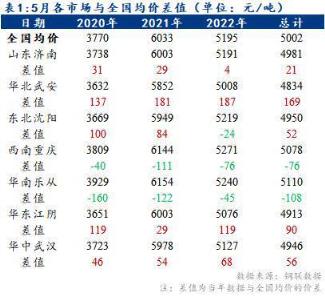 據鋼聯數據對各區域主流市場及全國均價的5月價差數據分析:山東、東北今年價格較全國平均水平有所抬升,華北、華南、華東、華中較全國平均水平有所下降;